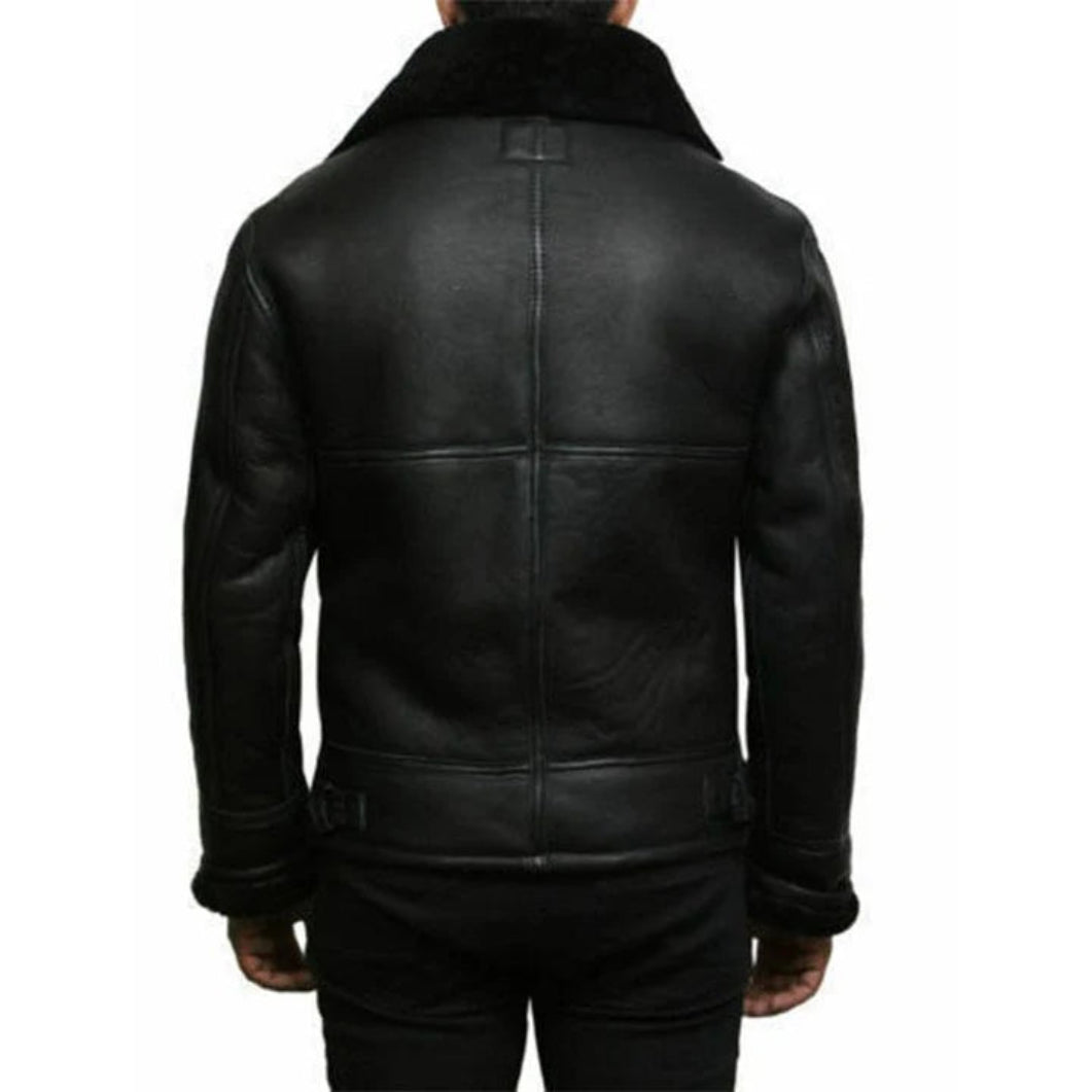 Command attention with this Black Aviator Leather Jacket, a rugged yet refined tribute to classic flight gear. Made from 100% genuine sheepskin leather, it features a soft synthetic fur lining and a wide fur collar with adjustable buckle straps, offering both warmth and iconic aviator flair.
